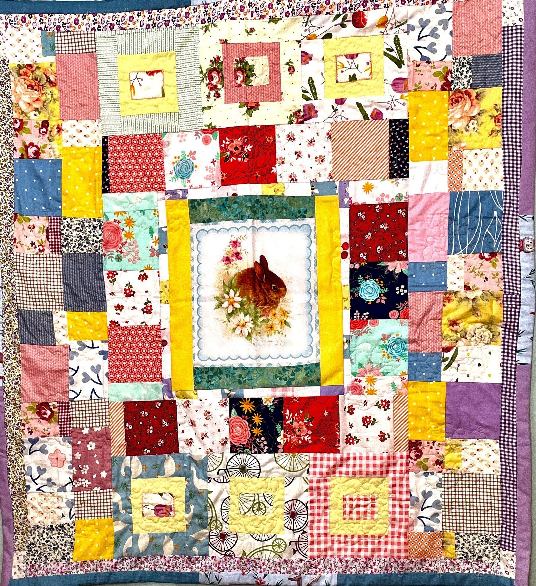 Bunny quilt made with patch work 100% cotton with fleece backing. Great for anyone that loves baby animals, children, babies, elderly, teens and everyone in between. 45" x 45"